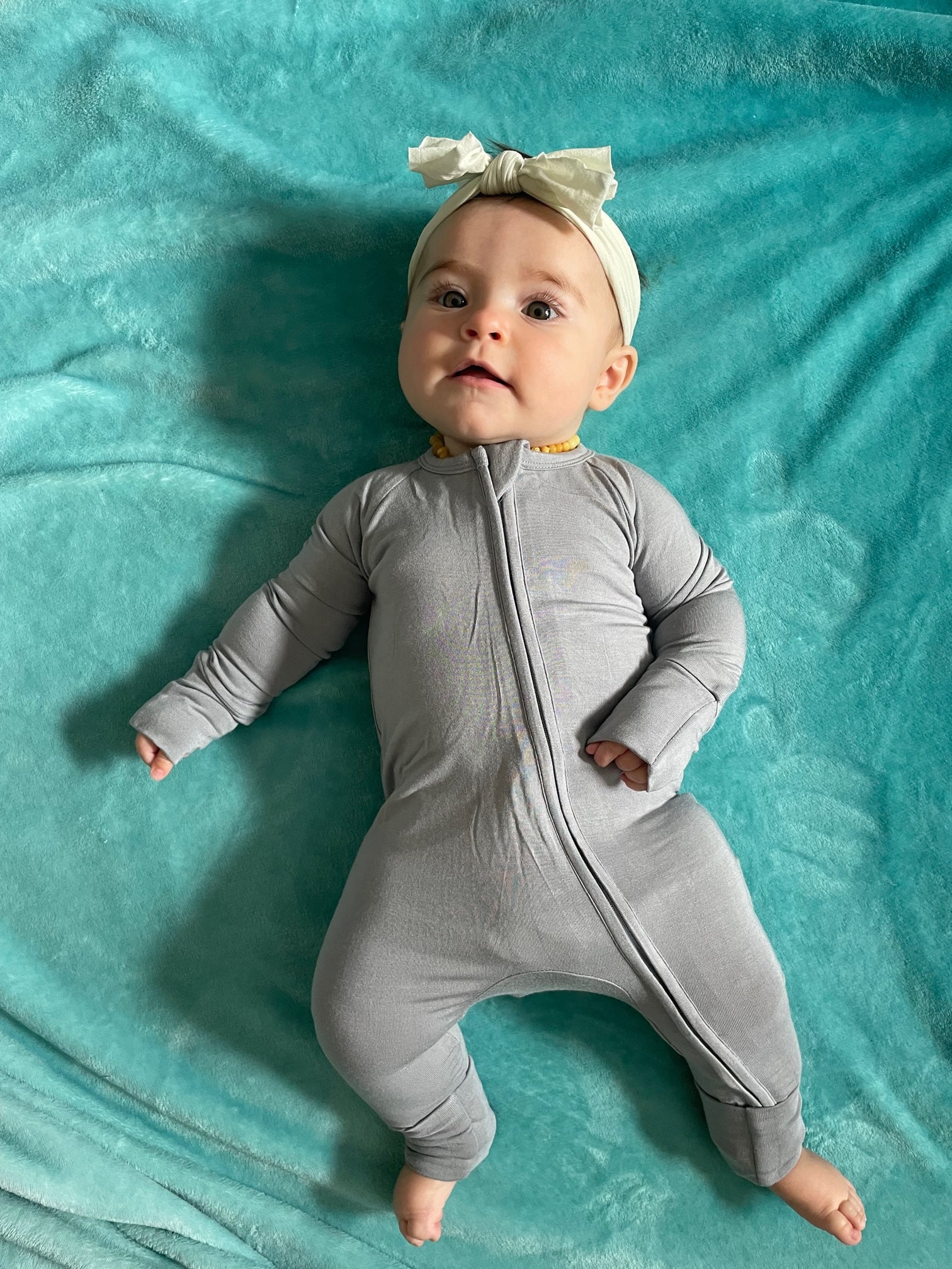 Model is wearing a 3-6m -- See Size Chart in photo for correct sizing. Sizes run generous and should last at least 3x as long as traditional sleepers.