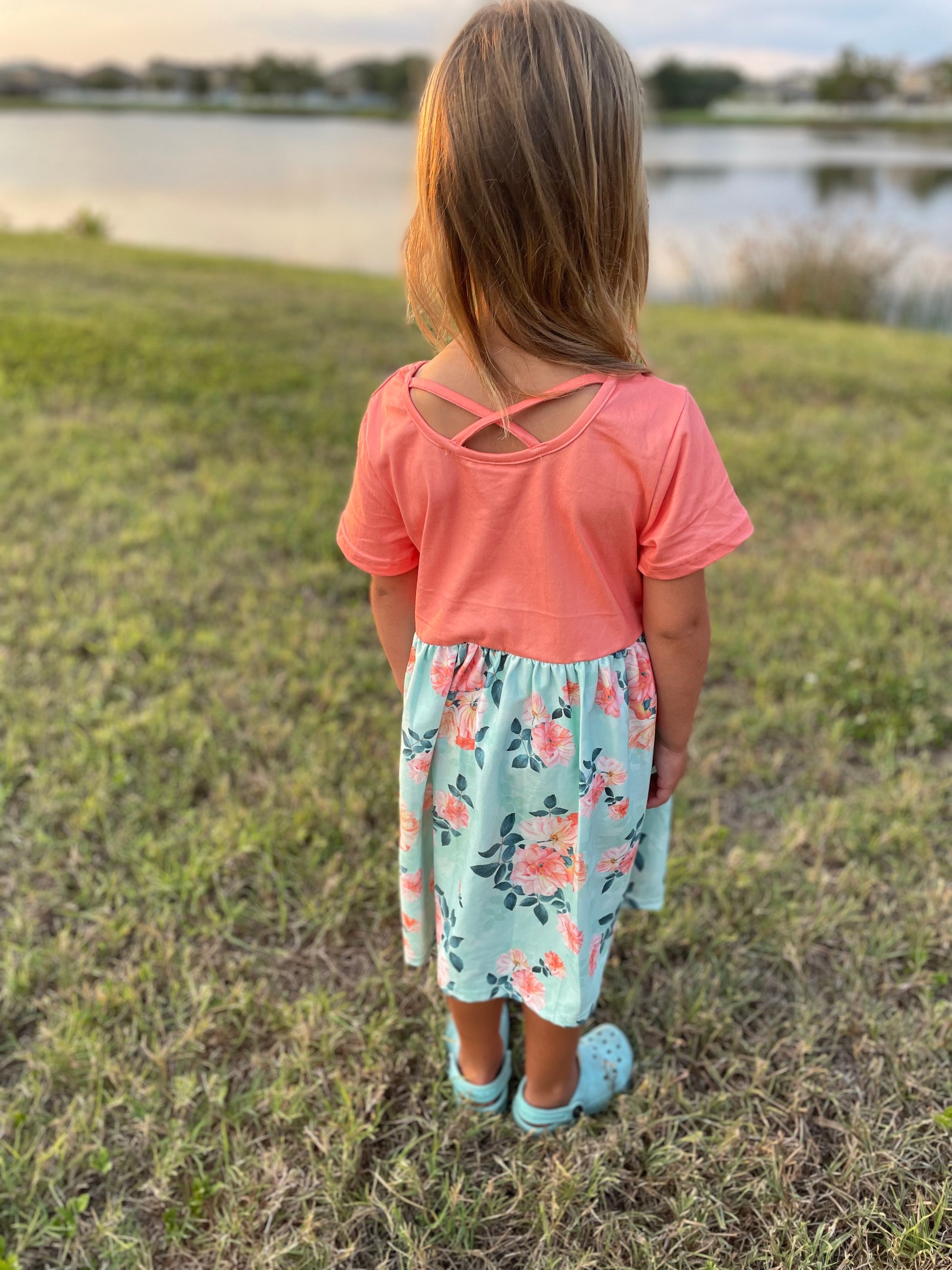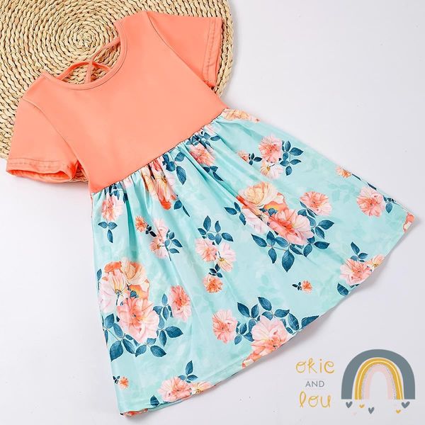 This Coral Floral Dress is sure to be a treasured classic in your little girl's wardrobe. Crafted from luxurious milk silk, this delightful piece is adorned with a coral-hued top and a floral print skirt, perfect for special occasions or simply twirling in the garden. Also check out the matching infant romper! It's perfect for those little girl's who love to match their baby sister!