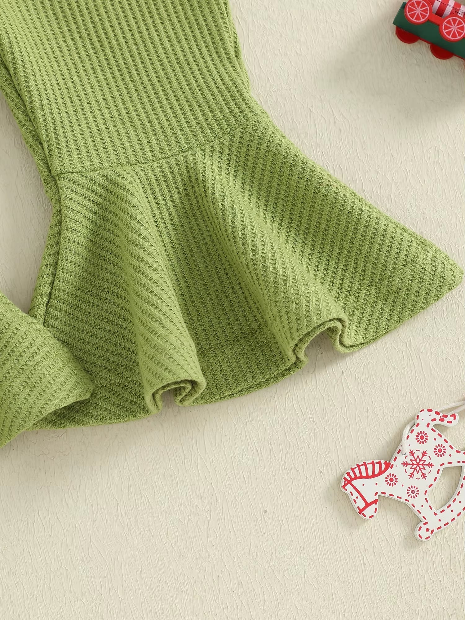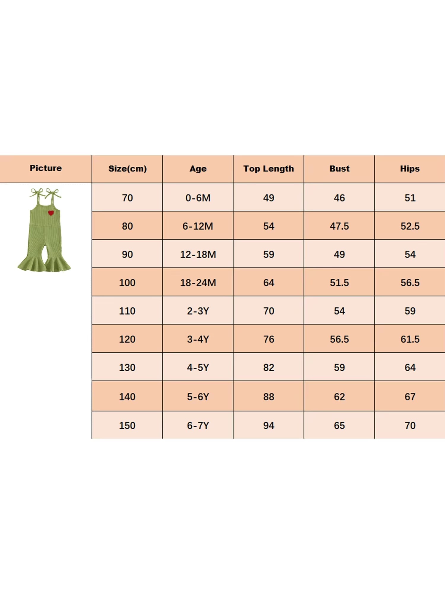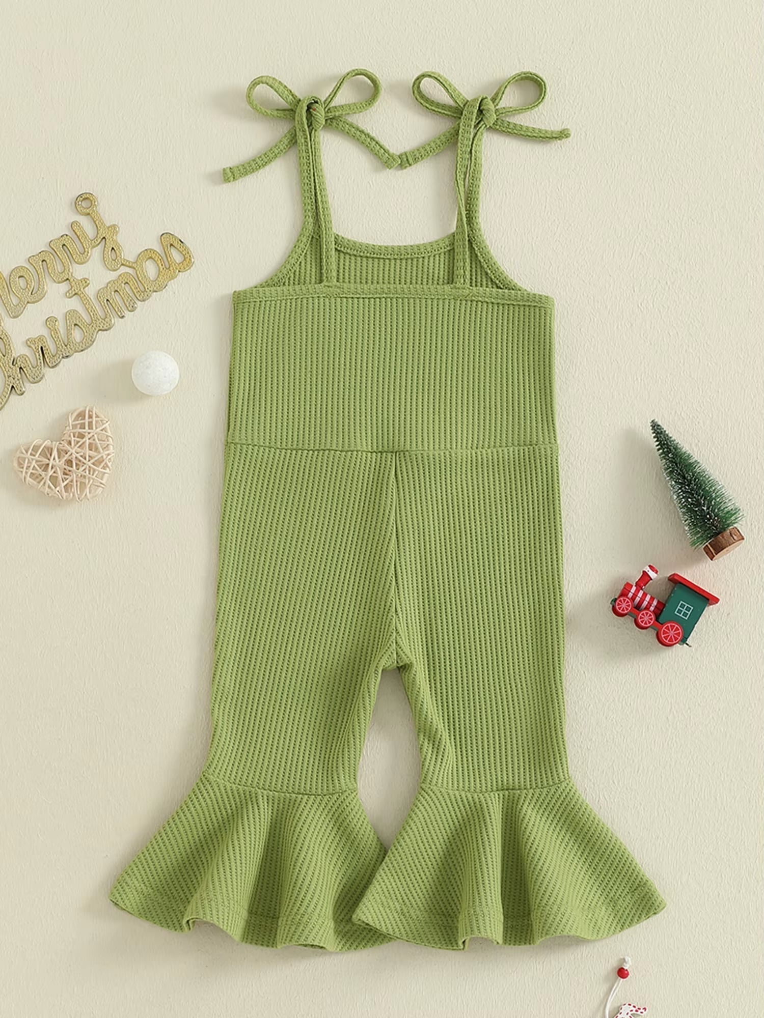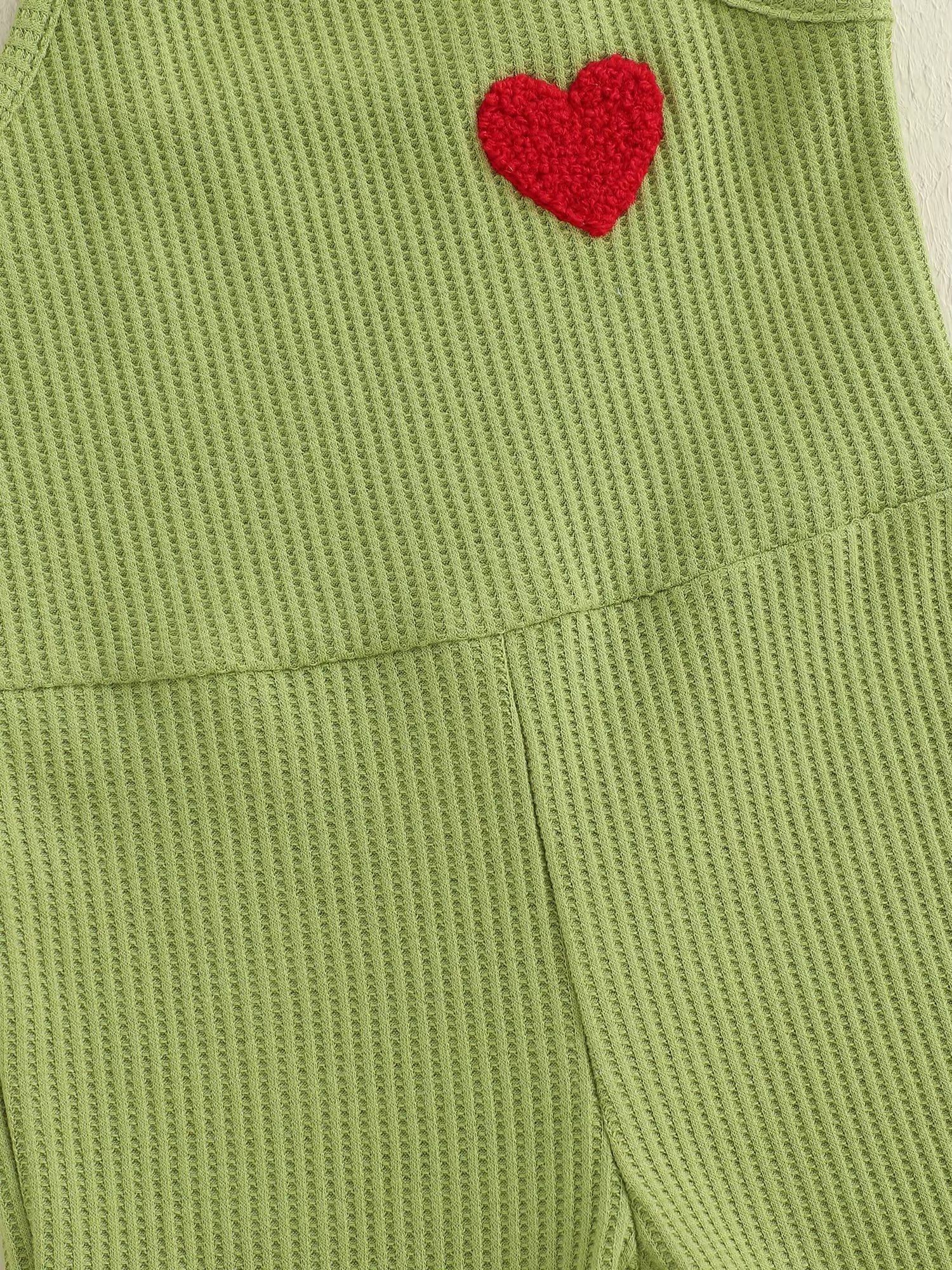 This adorable little kids romper features charming ties at the shoulders for an adjustable, comfy fit. A small heart embroidered on the left side adds a sweet, loving touch. The bell-shaped bottoms on the pants give it a playful, whimsical flair perfect for everyday fun and special moments alike.