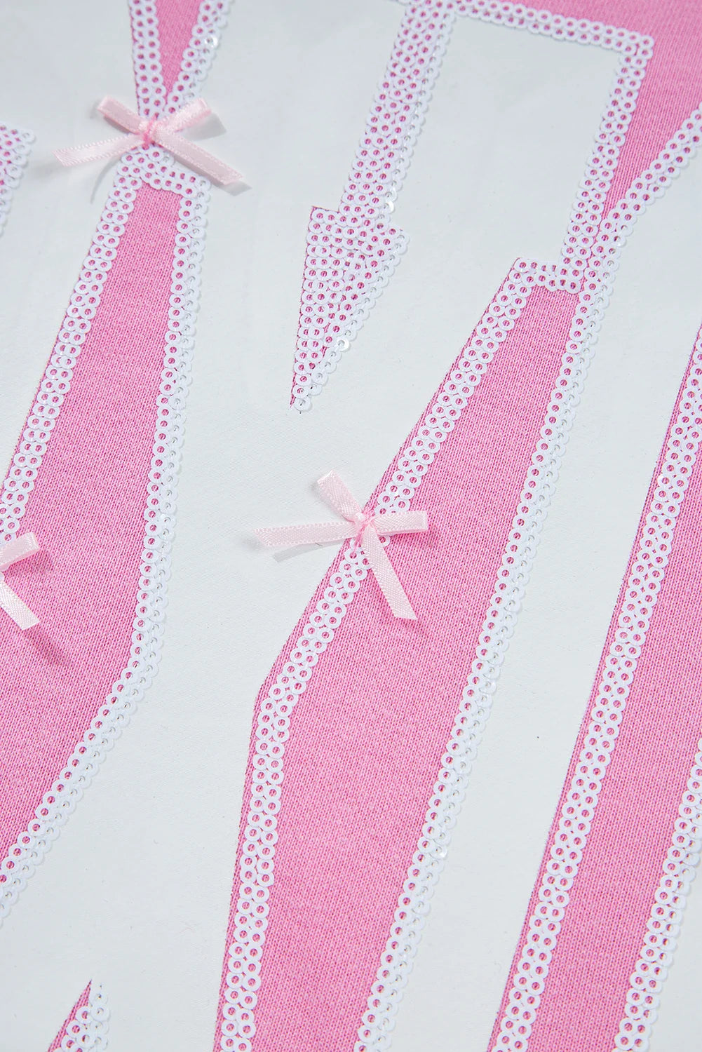 Spread the love with this adorable pink long-sleeve top featuring a bold white "xoxo" graphic adorned with delicate bows. The split V at the sides offer a flattering, comfortable fit that moves with you. Perfect for expressing your affectionate side with a touch of whimsy and charm.