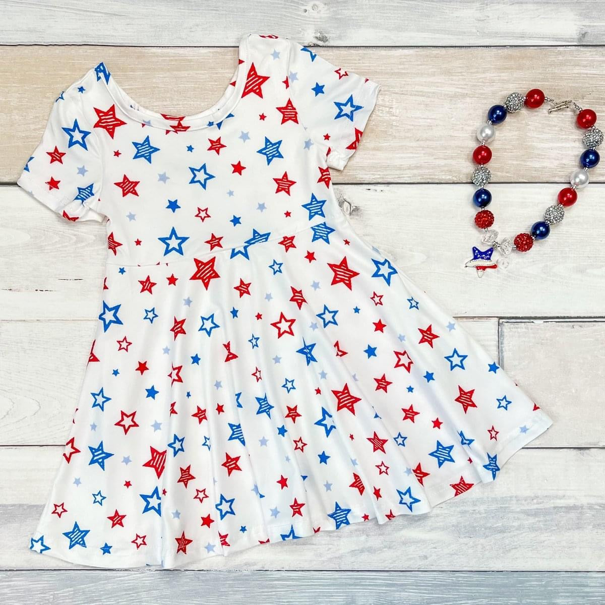 Let your little girl shine like a star this Fourth of July with our exquisite Stars on Me - White Dress. Featuring a delicate white fabric adorned with delicate star prints, it is the perfect addition to any stylish wardrobe. Let her be the ultimate trendsetter in this classic piece.