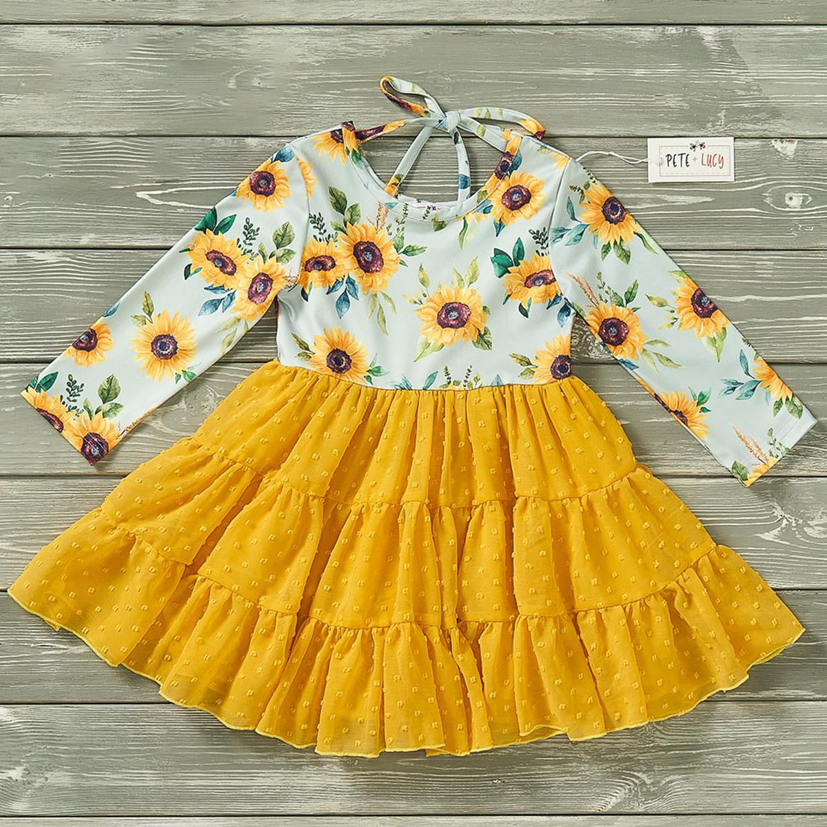 This Long Sleeve sunflower printed dress is a girl's dress made from high-quality materials with a vibrant sunflower pattern that will remain in style for years to come. It comes with long sleeves for added warmth and additional style. The dress is sure to be a hit for any occasion!