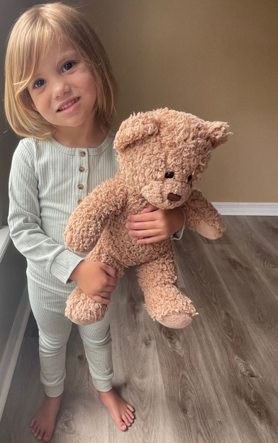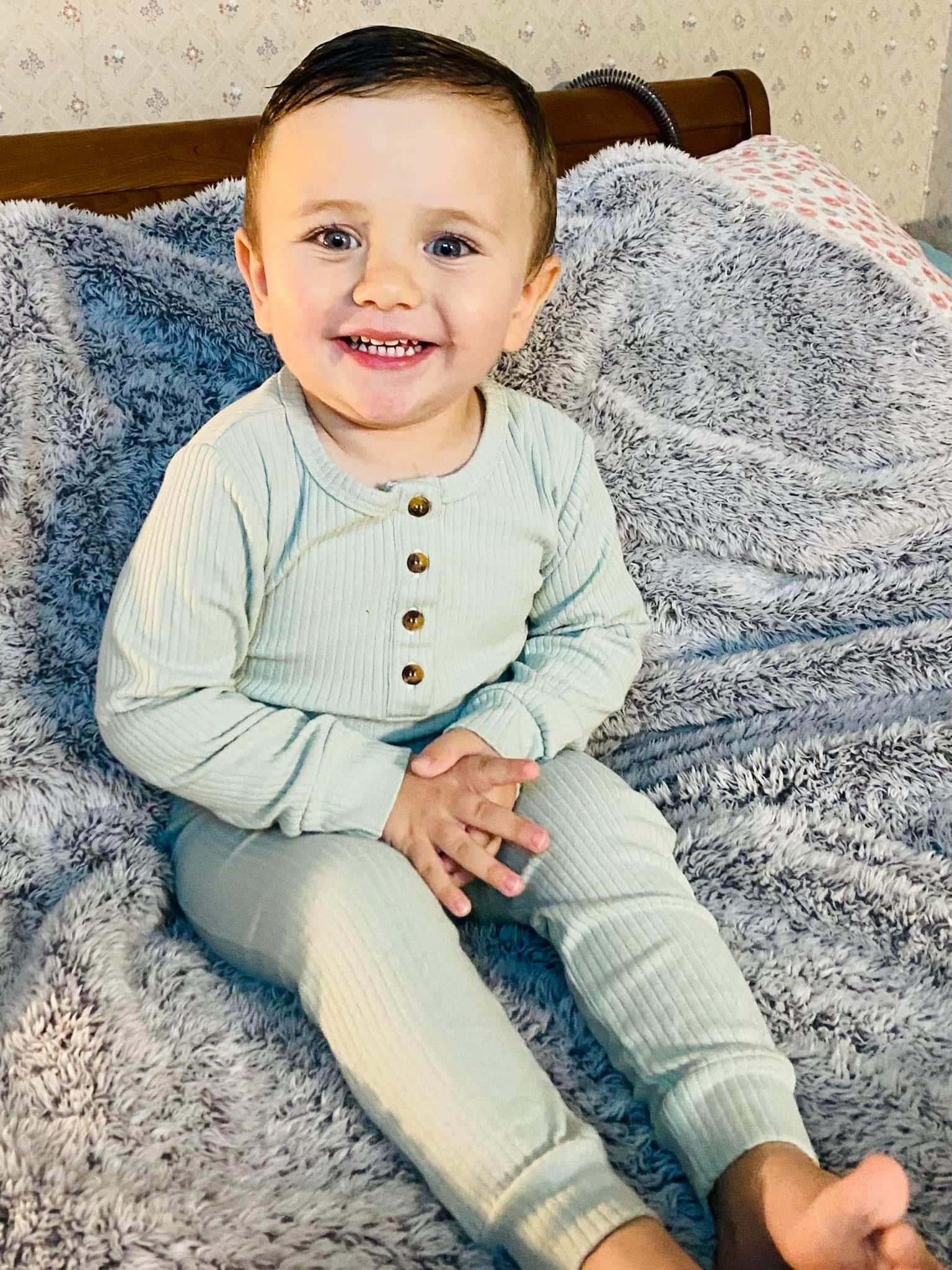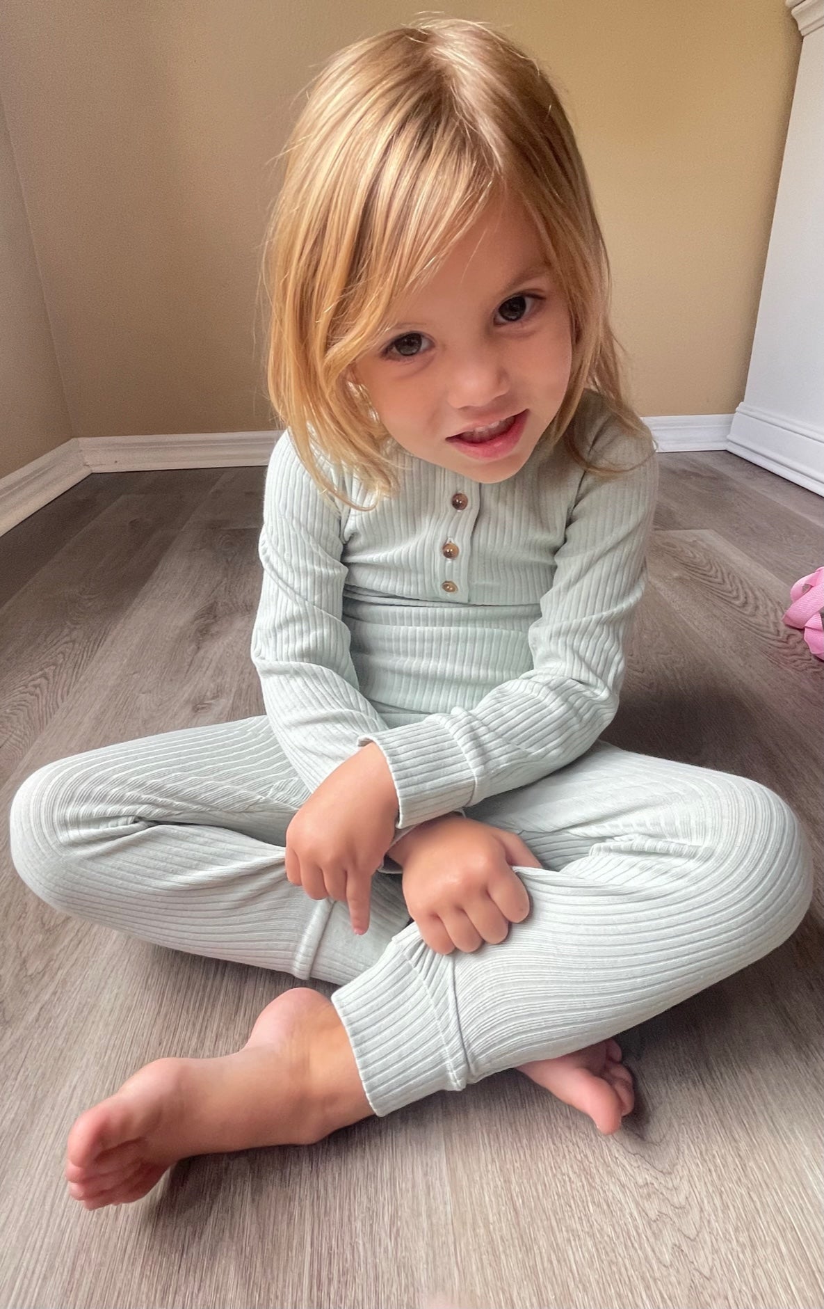 This two piece set is a neutral sage color featuring a classic button top. The fabric is a ribbed cotton spandex material. Leggings fit like a harem type pant. Cuffs and waistband can be rolled or folded over for extender wear time.